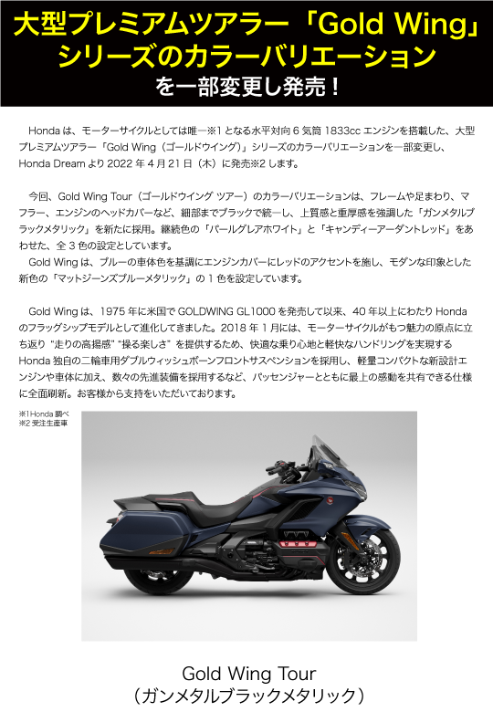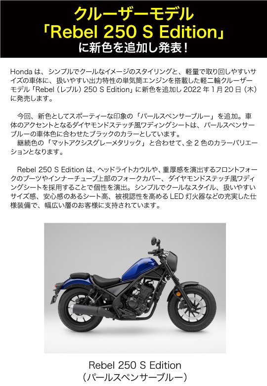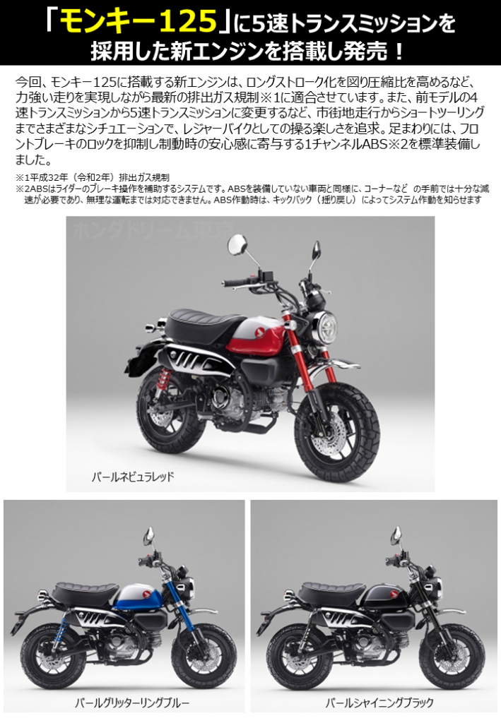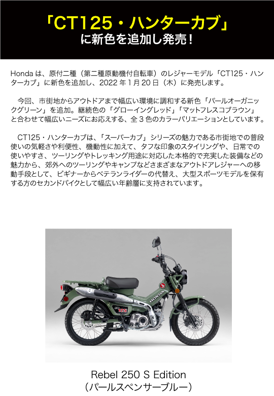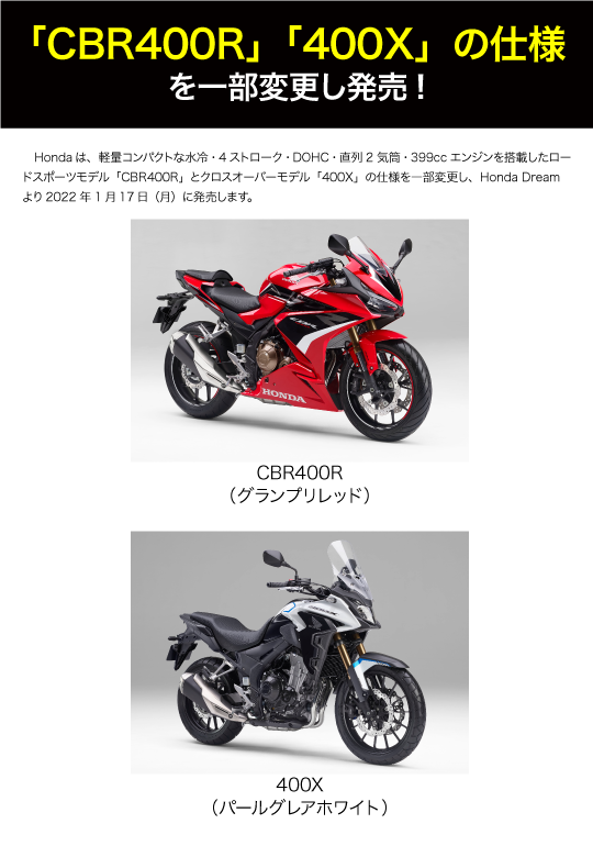 NEW BIKE NEW BIKE「HAWK 11」新型ロードスポーツモデル HAWK 11を発売! NEW BIKE NEW BIKE「ダックス125」新型レジャーバイク ダックス125を発売! NEW BIKE 「CBR400R」「400X」の仕様 を一部変更し発売! NEW BIKE 大型プレミアムツアラー「Gold Wing」 シリーズのカラーバリエーション を一部変更し発売! NEW BIKE クルーザーモデル 「Rebel 250 S Edition」 に新色を追加し発表! NEW BIKE 「CT125・ハンターカブ」 に新色を追加し発売! NEW BIKE 「CB1100 EX Final Edition」「CB1100 RS Final Edition」を発売 NEW BIKE 「モンキー125」に5速トランスミッションを採用した新エンジンを搭載し発売! NEW BIKE 「スーパーカブ C125」に環境性能を向上させた新エンジンを搭載し発売! NEW BIKE 「ADV150」に受注期間限定のカラーリングを設定し発売! NEW BIKE 「GB350」「GB350 S」新型ロードスポーツモデル GB350・GB350 S を発売! NEW BIKE 「フォルツァ」軽二輪スクーター フォルツァ をモデルチェンジし発売!