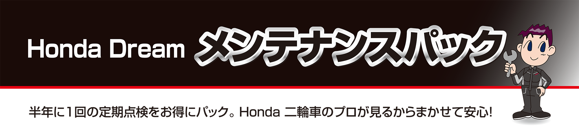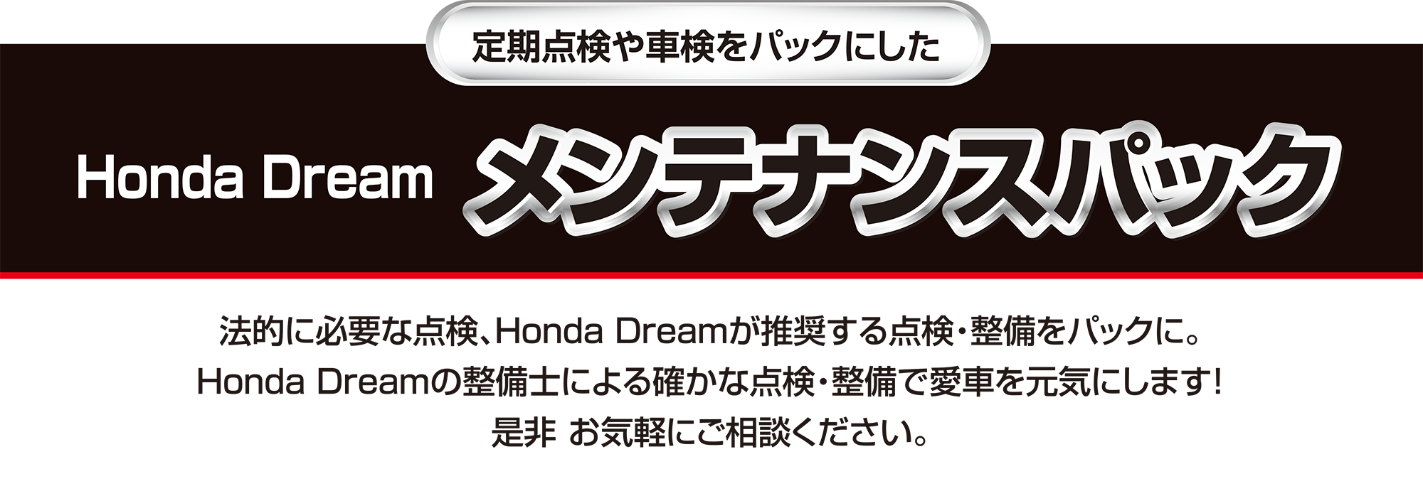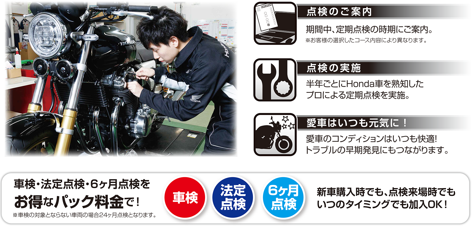 法的に必要な点検&Honda Dream が推奨する点検・整備をセットにしました。Honda Dream の整備士による確かな技術で愛車を元気に保ちます。